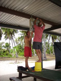 Hanging our Zephyr sign in the yotti shelter - Direction Island |